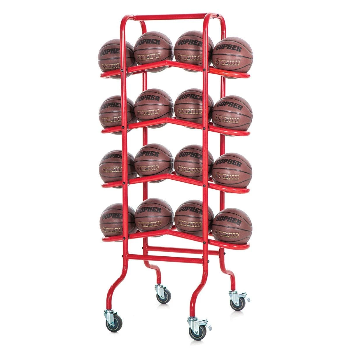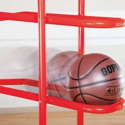 Just grab the ball and shoot! After loading balls on the cart, a slight angle in the center of each rack feeds balls to the ends for quick and easy unloading. When a player takes a ball, another quickly falls into place for the next player. This four-tiered ball cart holds 16 official size basketballs and quickly dispenses them from 2 sides for easy access.