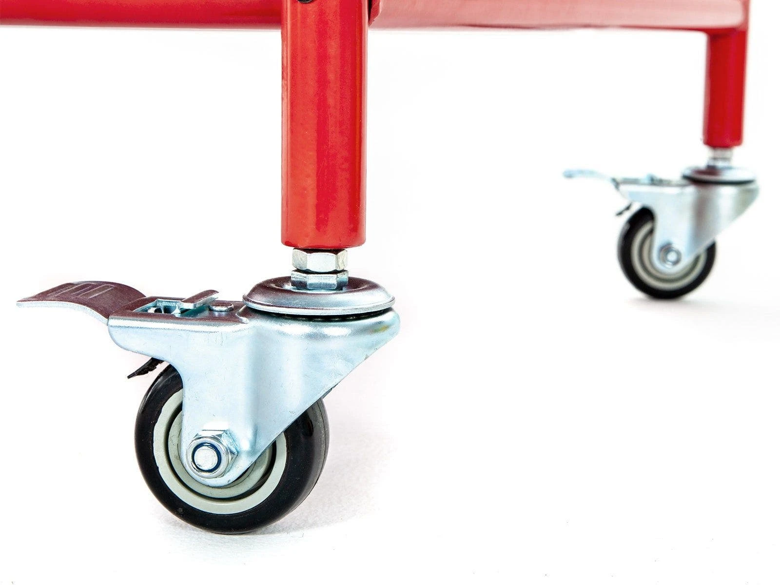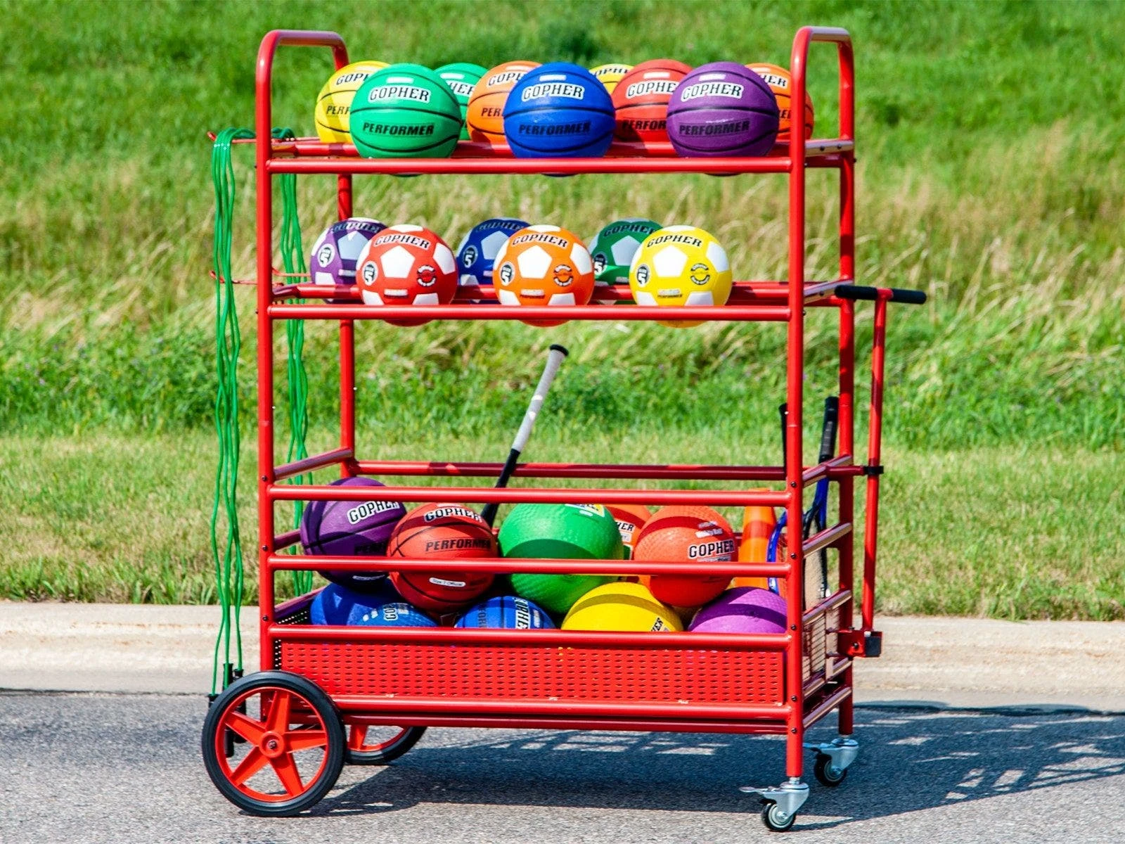 Made of 100% heavy-gauge steel, this equipment wagon easily handles institutional use. Durable powder-coating keeps the frame looking great and resists marring and rust for years. Plus, there are no visible screws or bolts, protecting balls and fingers during loading and unloading. Two swivel casters and two all-terrain wheels provide the perfect marriage of maneuverability and rugged traversability.