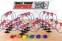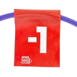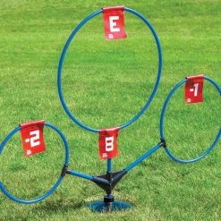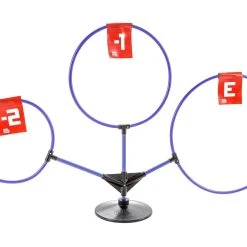Targets are made of 1” dia PVC tubing for long-lasting durability. Hole number and score flags secure to the target with hook-and-loop fasteners. Teachers can easily remove the flags to rearrange them. Score flags include -1, -2, and E. Players can use these varying values to change the score. For example, if a player throws 3 discs at the target and makes it through the hoop with -1 on it, the score for the hole would be 2. 71″W x 56”H.