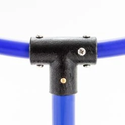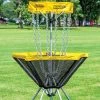 A custom three-way joint supports 3 disc golf target hoops (18”, 24”, 30” dia) for varied scoring possibilities. Three target arms in different lengths also create exciting challenges and keep the target stable. The various hoop sizes and arm lengths create an increased chance at success and different scoring possibilities.