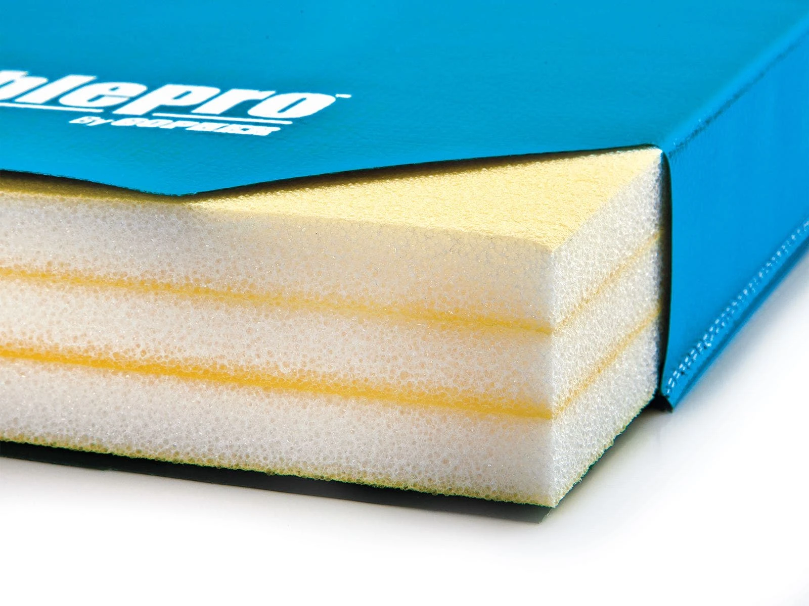 The textured 14 oz antimicrobial vinyl-coated fabric cover is also flame-retardant, washable, and mildew-resistant. Smooth, double-reinforced nylon-stitched seams provide the strength to give these mats a long life. Because the foam won’t absorb water, you can use these premium gymnastics mats indoors or out.