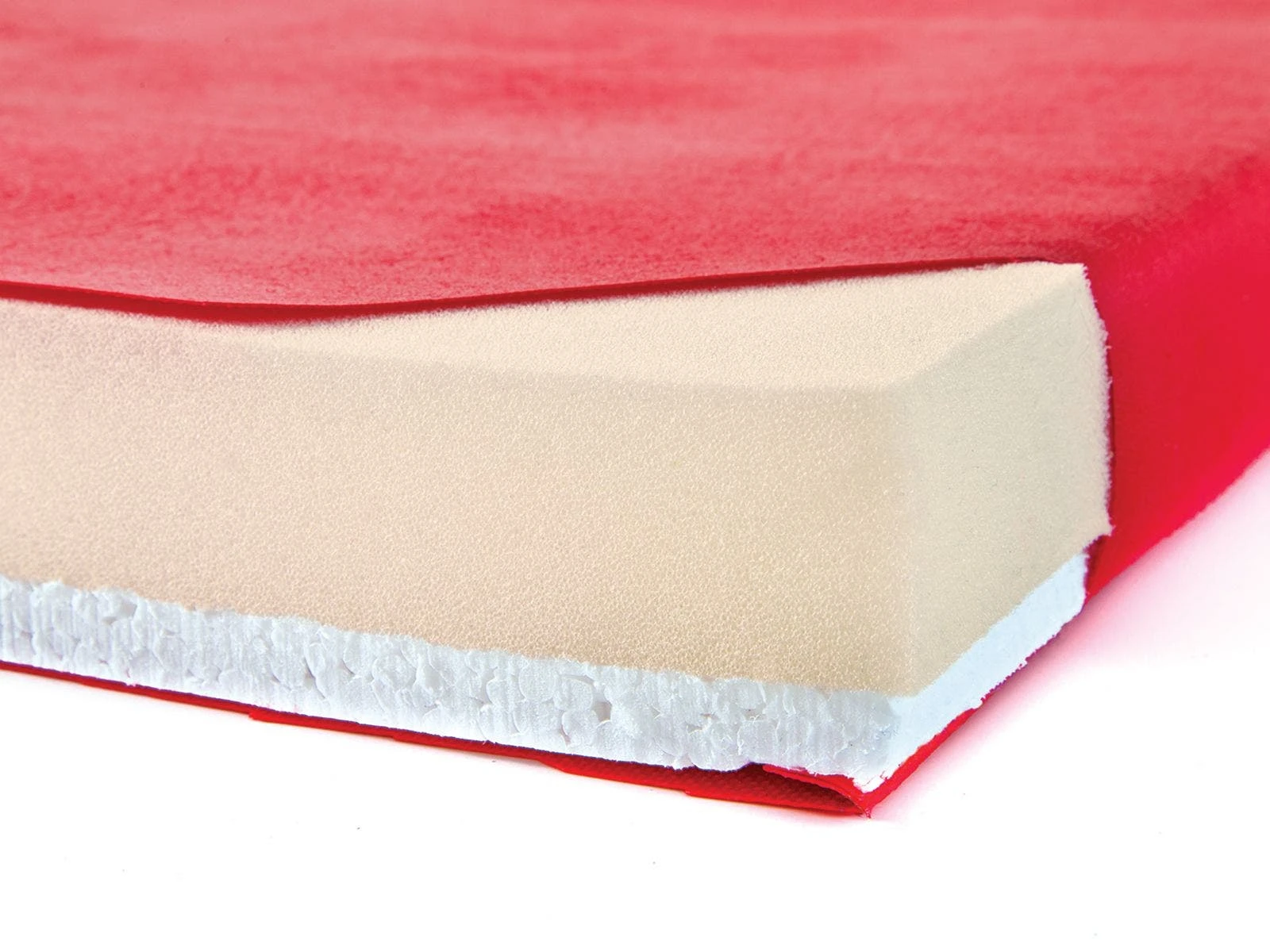 One side features a 1-1/2” layer of soft urethane foam for basic exercise, tumbling, and low-impact gymnastics with elementary students. Turn it over to a 1/2” layer of firm closed-cell foam for high-impact activities with older users who need more recoil and energy-return.