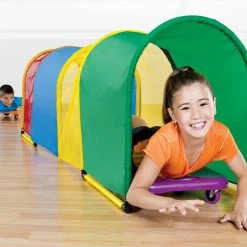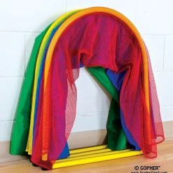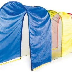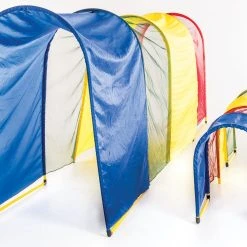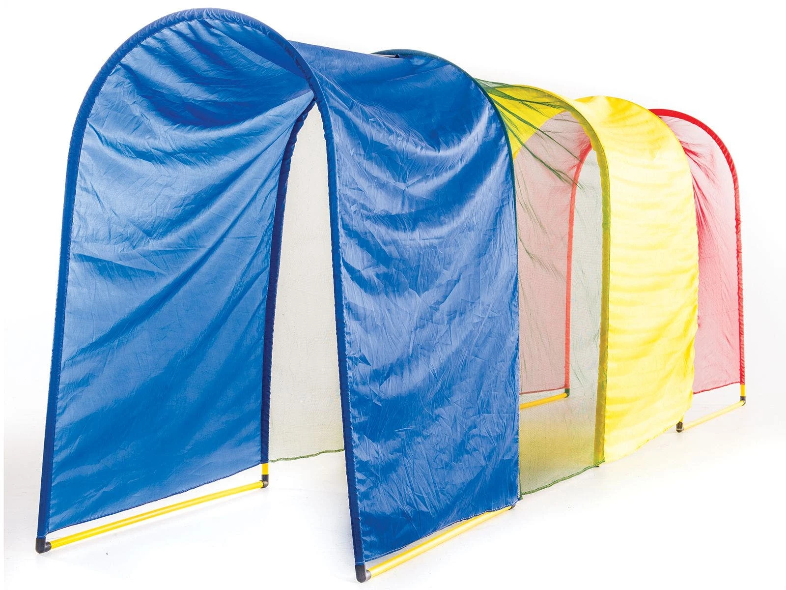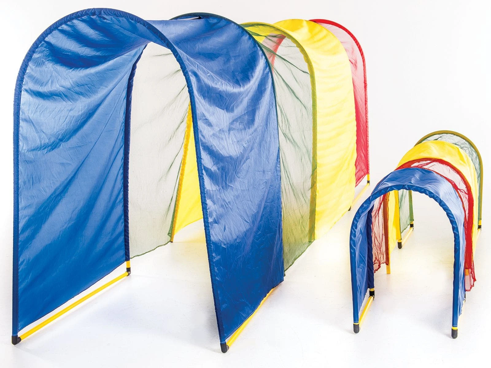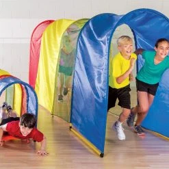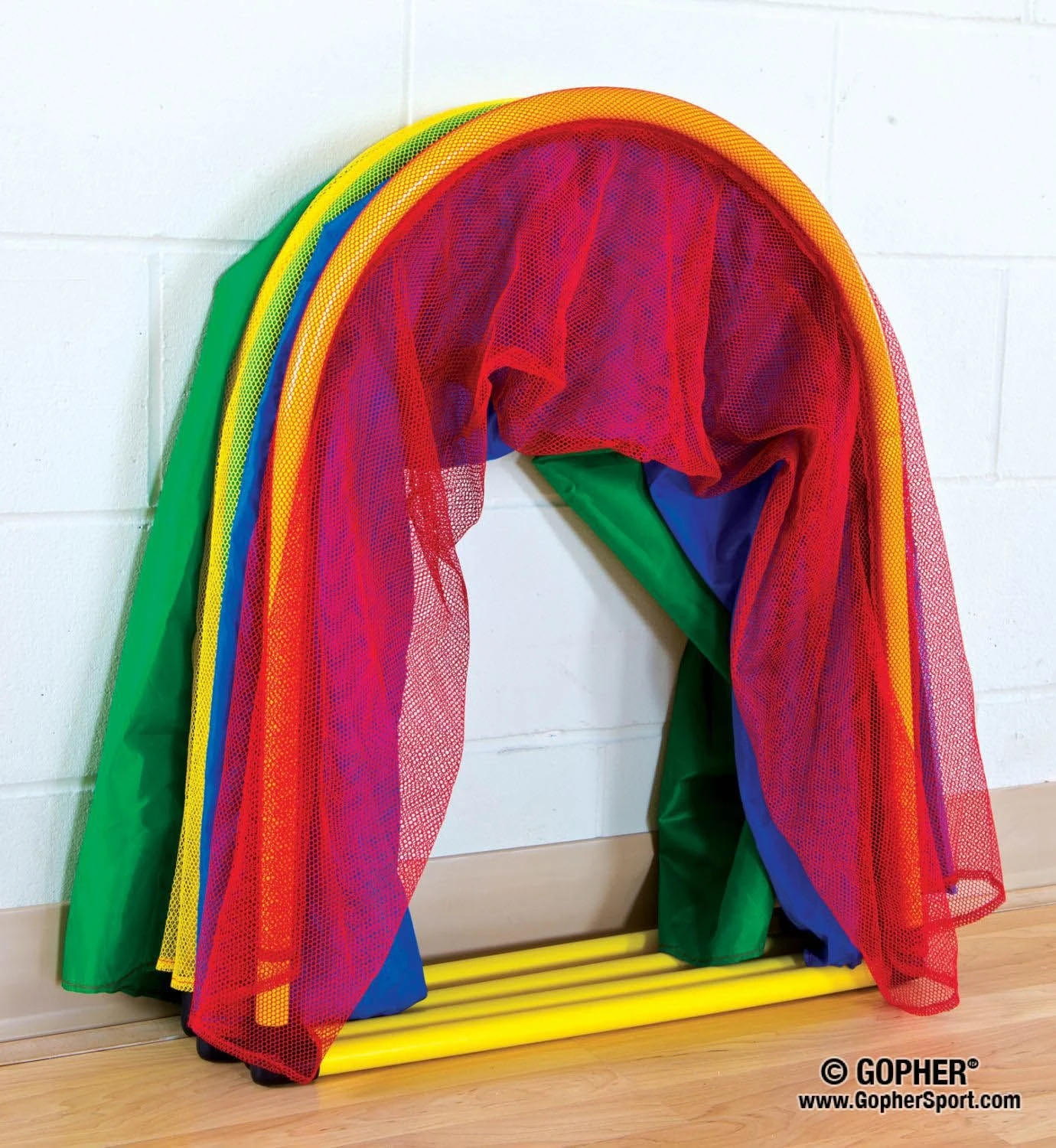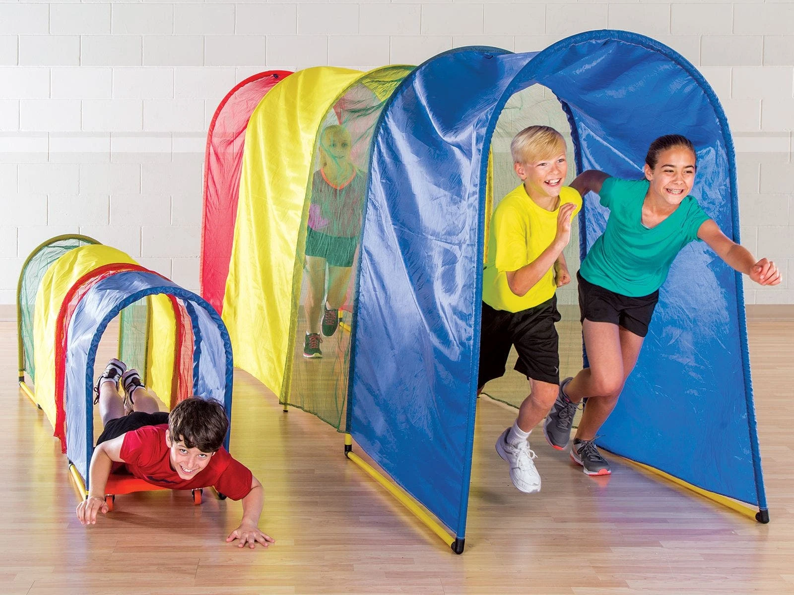 Lightweight mesh and polyester fabric covering is durable, while the strong PVC frame stands up to both indoor and outdoor use. See-through mesh allows teachers to monitor kids as they navigate through the tunnel. When class ends, simply remove the bottom poles and collapse the tunnels for quick and easy storage. Assembly required.
