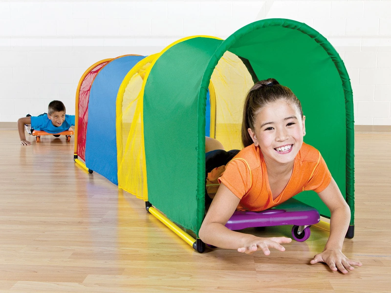 Standard size tunnels are great for younger students, allowing them to crawl or slide through on scooters. The smaller design teaches students about spatial awareness, and encourages them to consider angles, dimensions, and proportion while traversing tunnels. Jumbo tunnels are ideal for running through and accommodate students up to 4’H. At 3’W, these large tunnels are also great for partner drills and races. Teachers can also use both sizes to create fun obstacle courses.