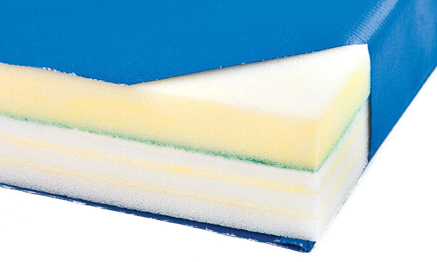 The 2-3/8” thick mat is constructed with a 1-3/8” thick layer of polyethylene foam with a 1” thick layer of extra-soft urethane foam underneath. Each mat will withstand years of use thanks to the durable 21-oz vinyl cover that resists bacteria, flames, and general wear. A high-tenacity thread ensures the seams will not fail.