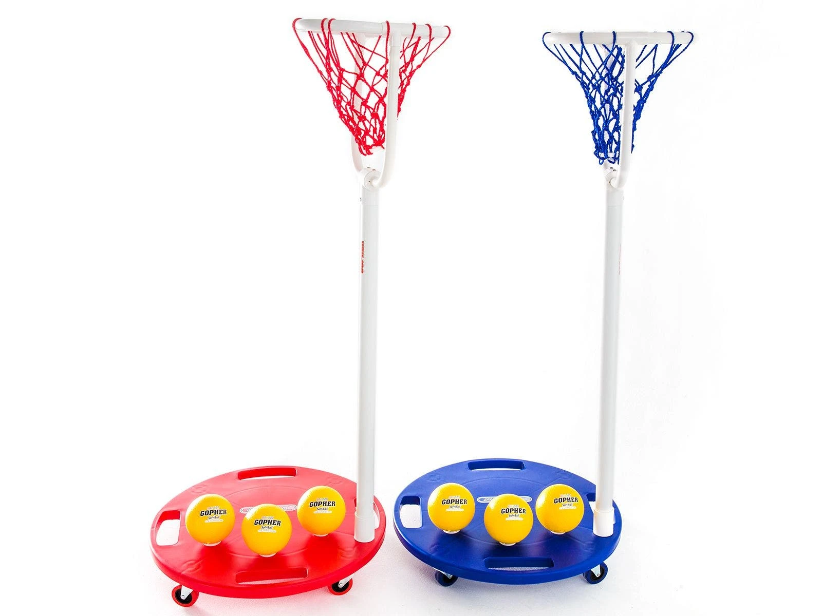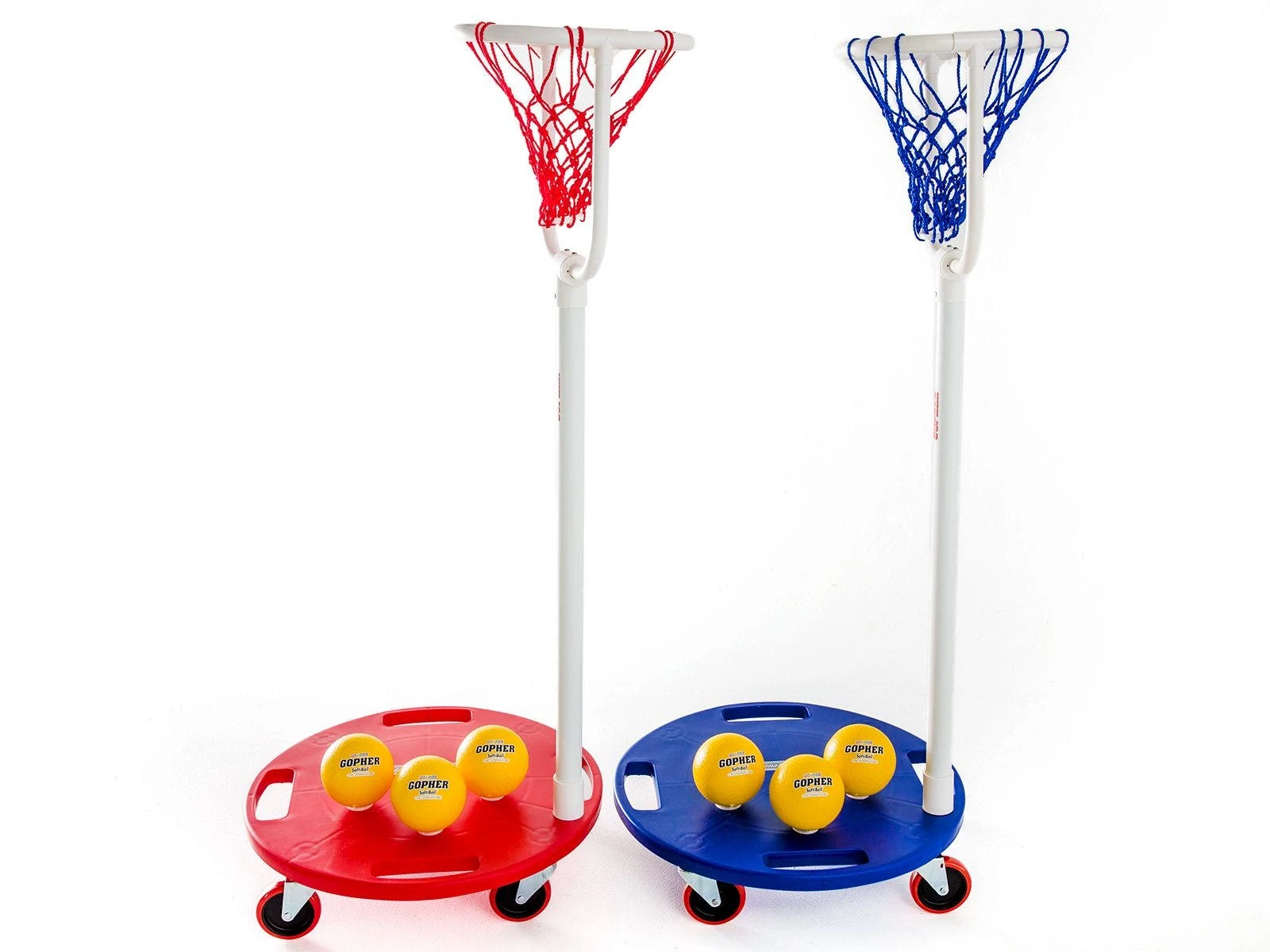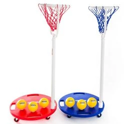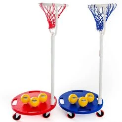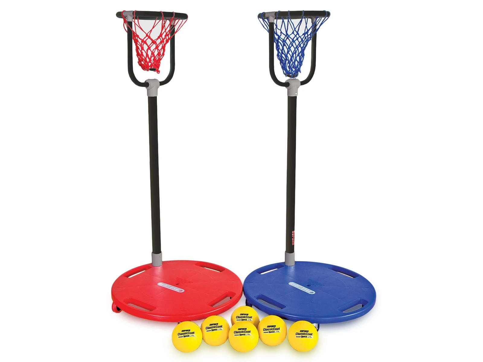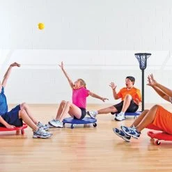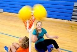 Assign 1 team the red hoop scooter and the other the blue hoop scooter. Each team tries to score as many baskets as possible with the foam balls during the allotted time. Increase the activity by throwing in more balls (sold separately)!
