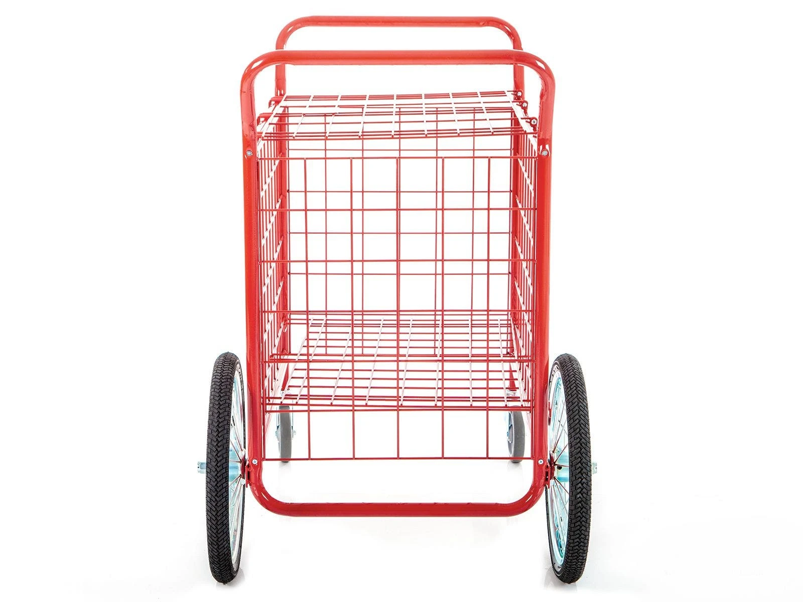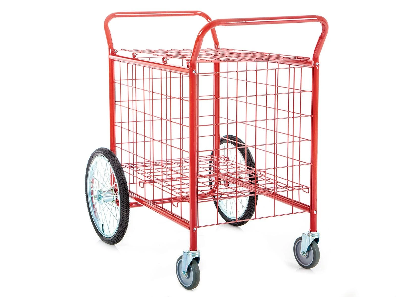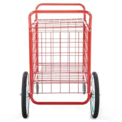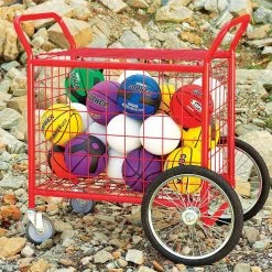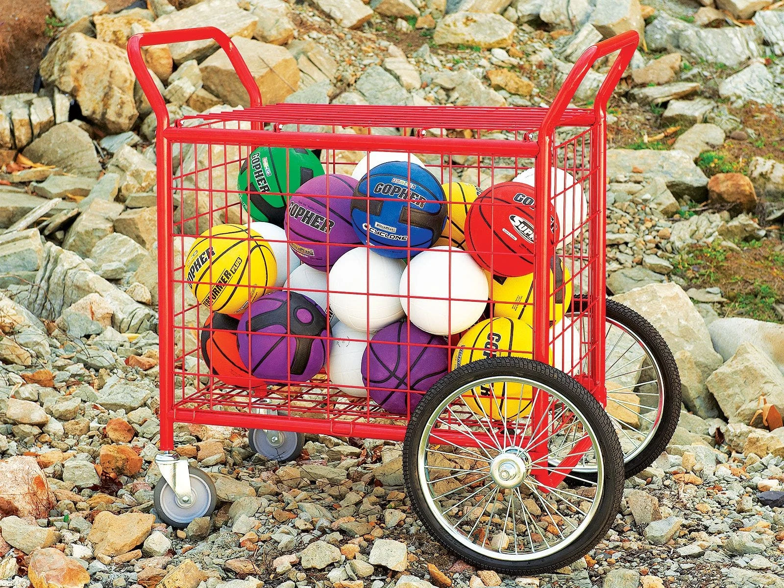 Massive 20″ rear tires and 6″ front tires transport balls and equipment over curbs, stairs, rocks—you name it! Pneumatic treaded tires provide sure-footed traction on a variety of surfaces. heavy-duty ball-bearing casters deliver exceptional maneuverability. U-shaped handles at both ends make pushing and pulling over obstacles a breeze. A 1-1/4″ dia steel frame is welded at critical support joints and powder-coated for maximum strength and durability indoors or out. Does not include a Side-Empty door. Holds 24 official basketballs. Assembly required. Replacement casters and wheels are not compatible with this cart. 45-1/2”L x 34”W x 46”H; 68 lb