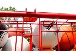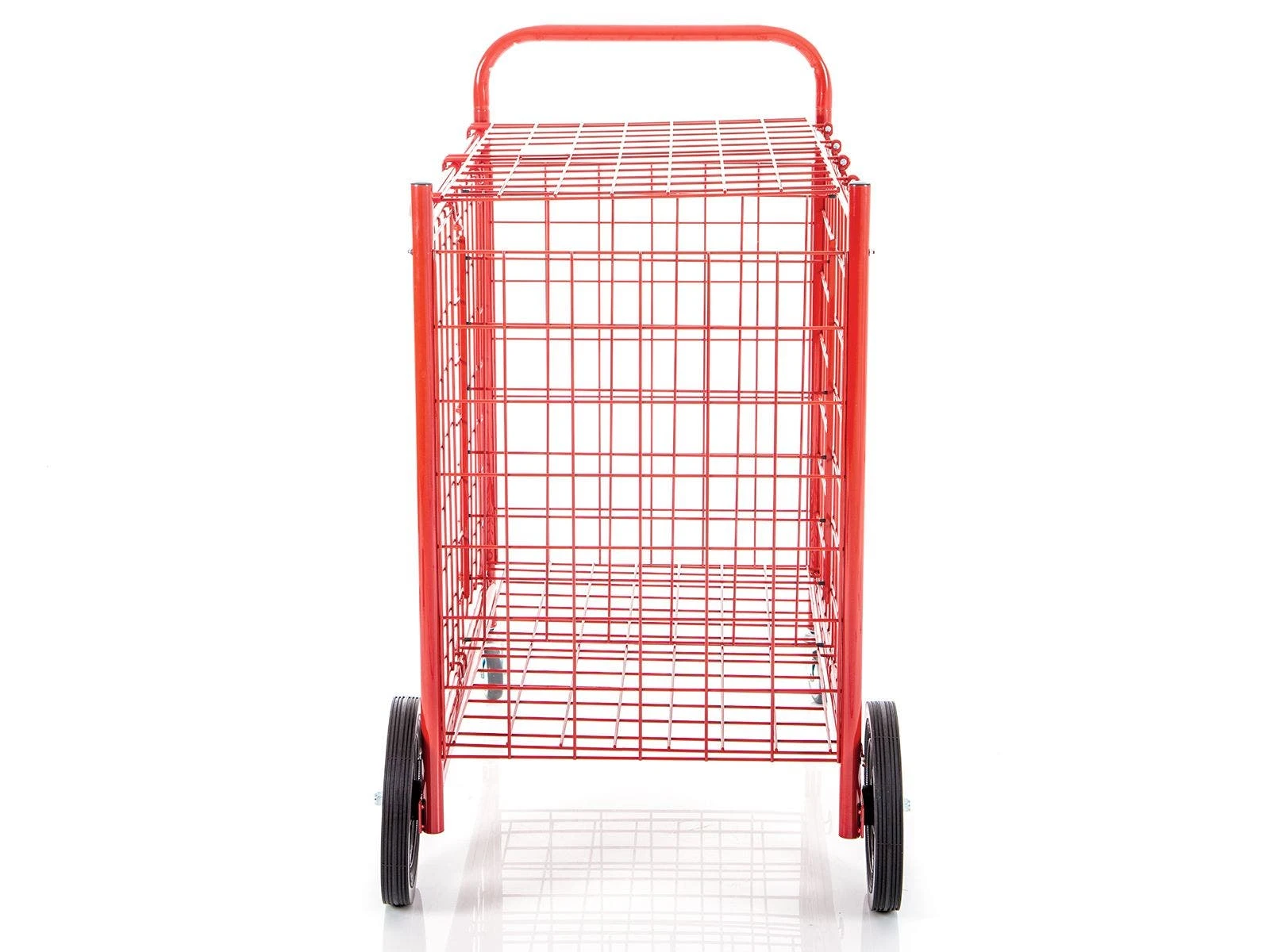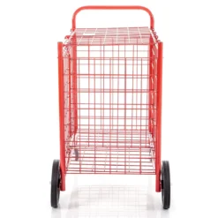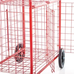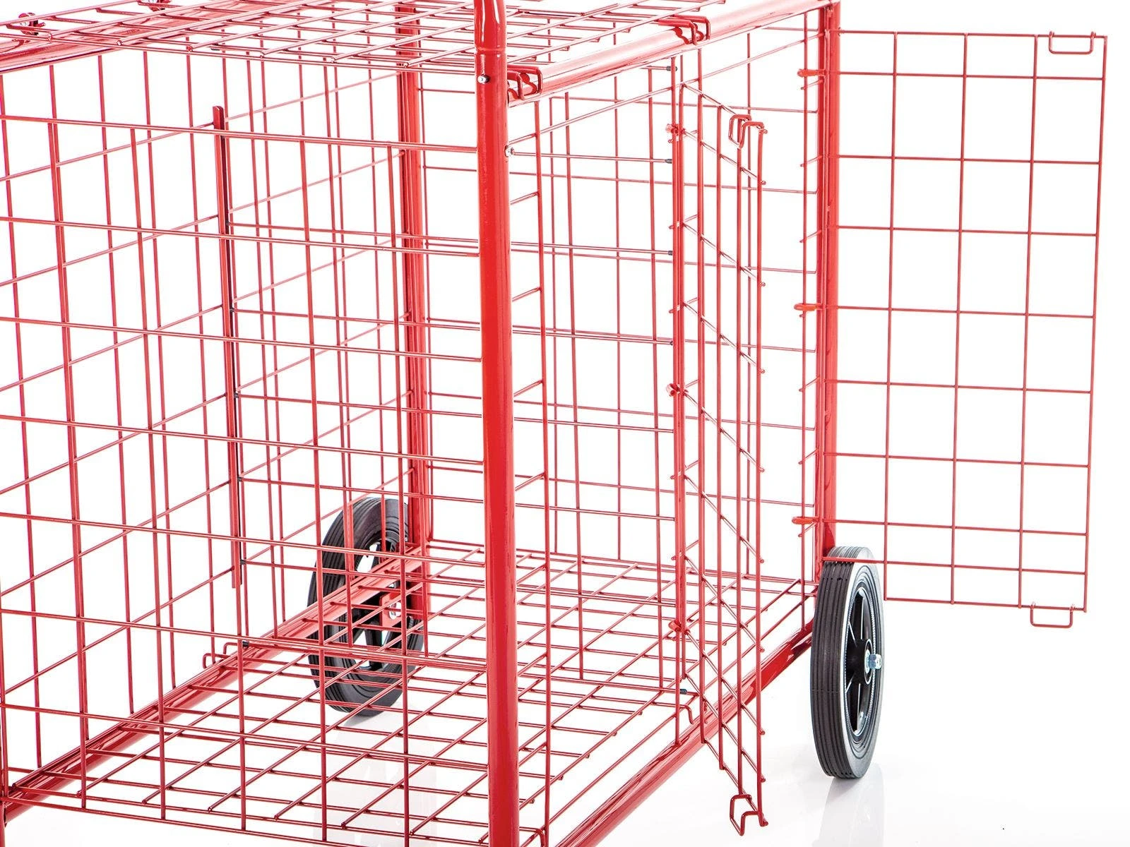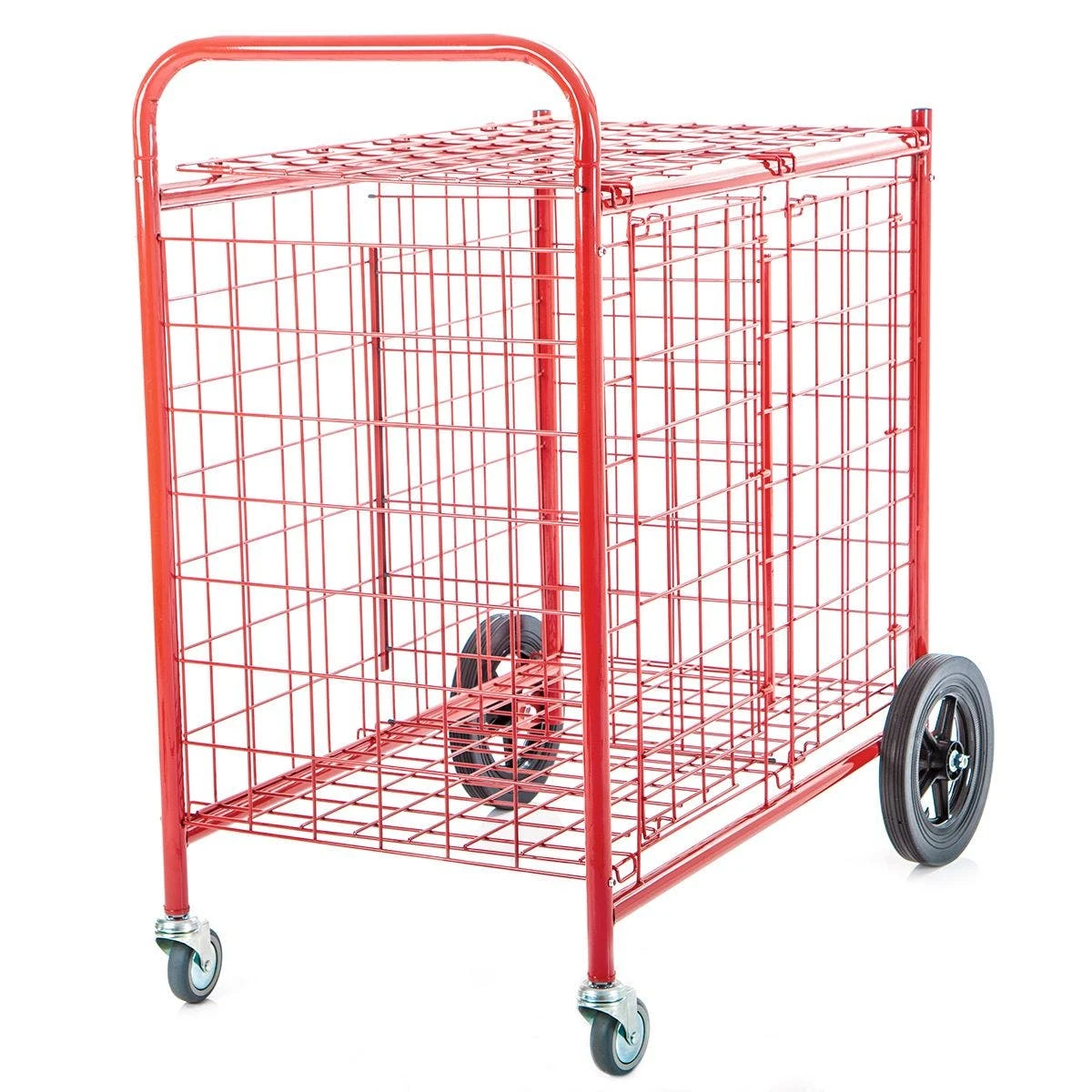 This roomy storage cart is extra wide while still easily fitting through standard doorways. It is equipped with a convenient Side-Empty door and sloped mesh bottom to save time on unloading for quick game play, while the top lid provides easy cleanup. Powder-coated 1-1/4″ dia steel tubing and wire mesh is virtually indestructable!. Includes two 4″ dia wheels with ball-bearing casters and two 12″ dia all-terrain wheels for easy maneuverability both indoors and outdoors. A chest-high U-shaped handle also makes gripping and controlling easy to prevent accidents. Divided compartment holds 2 types of balls. Holds 36 official basketballs. Assembly required.