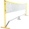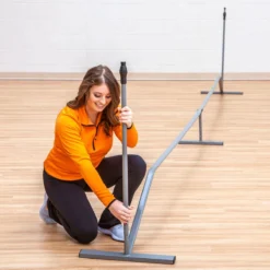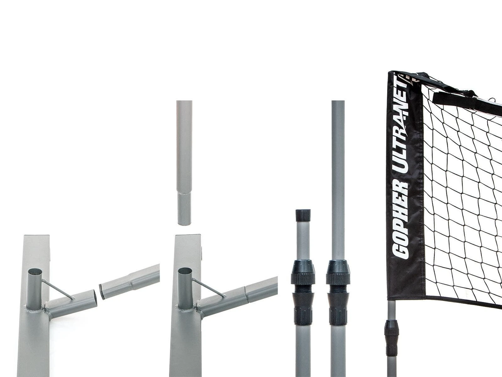 Steel tubing base features a bungee cord design that speeds up assembly. Next, telescoping uprights twist in one direction to loosen for height adjustment (up to 61″H or lower for other activities), then twist in the opposite direction to tighten. Both designs speed up setup and eliminate the opportunity to lose extra parts. Powder-coated, oval steel tubing lasts for years and a center support enhances the system’s stability. Net tension straps on both ends ensure a taught net and are also adjustable. Full banding protects net. Store the entire system in a durable storage bag. System is 20″W x 61″H; 27 lb. Replacement Net is sold separately.