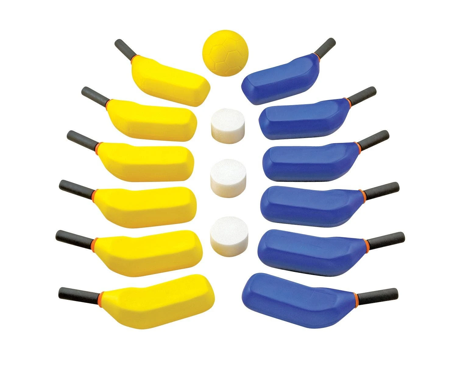 Set includes 12 sticks (6 yellow/6 blue for easy team organization), 3 foam pucks (white), and 1 foam ball (7″ dia). Use the ball instead of the pucks to speed up the pace of the game.