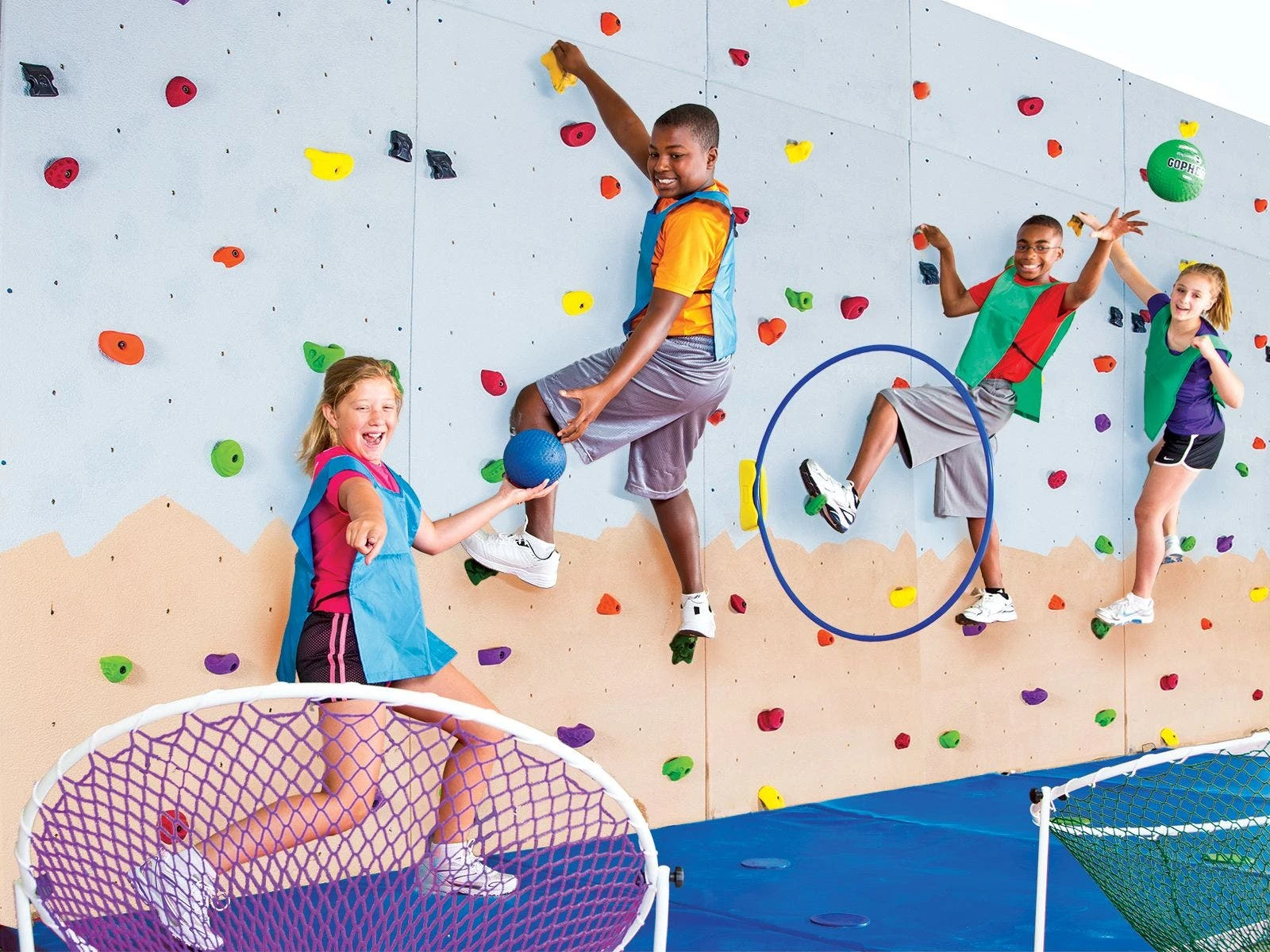 All equipment comes in vibrant Rainbow colors and makes organizing activities easy. Teachers can assign students a color or assign point values to each color. Activity guide features dozens of easy-to-implement games and activities. Traverse wall and safety mat not included.