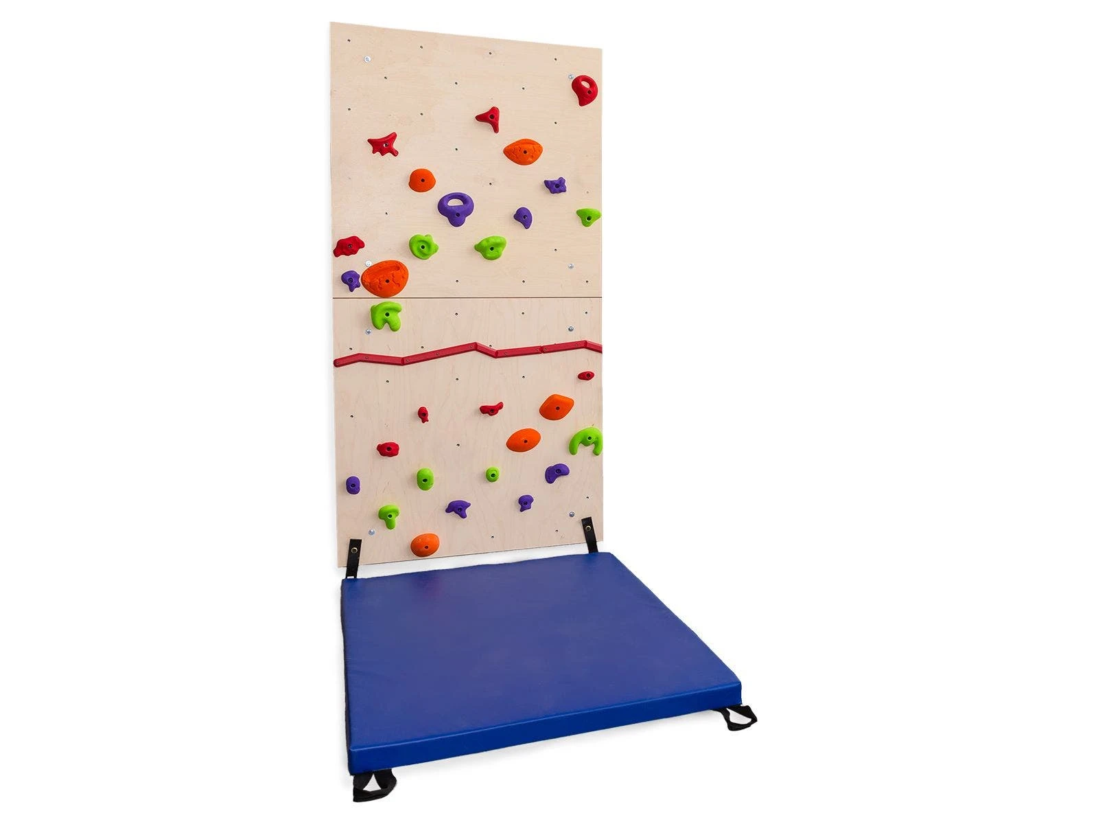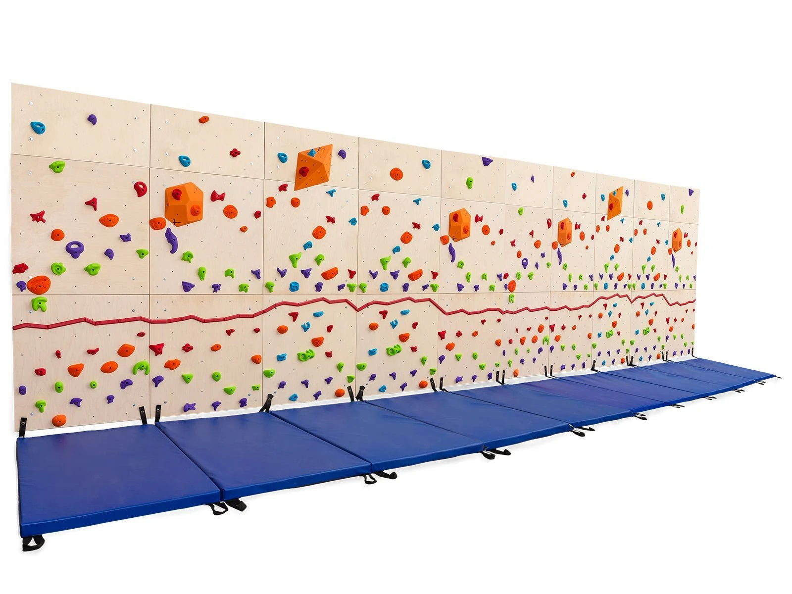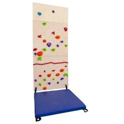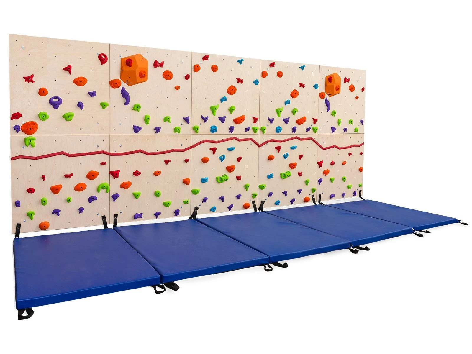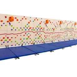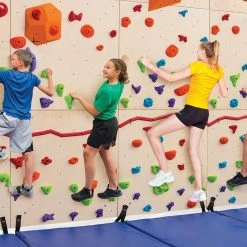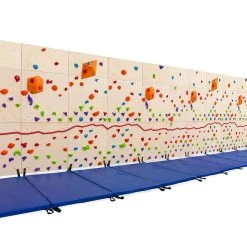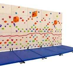 Each 3/4″ thick panel is made of Baltic Birch and has a more modern, natural wood look with a textured clear coat that enhances the beautiful grain in the wood. Each panel includes 66 preset placement options for mounting hand holds, allowing teachers to choose where to place the holds. Walls are anchored into place for supreme stability. Mounting hardware and assembly instructions included. The ULTRAVERSE Cordless Mat Locking System (sold separately) is recommended for every climbing wall installation.