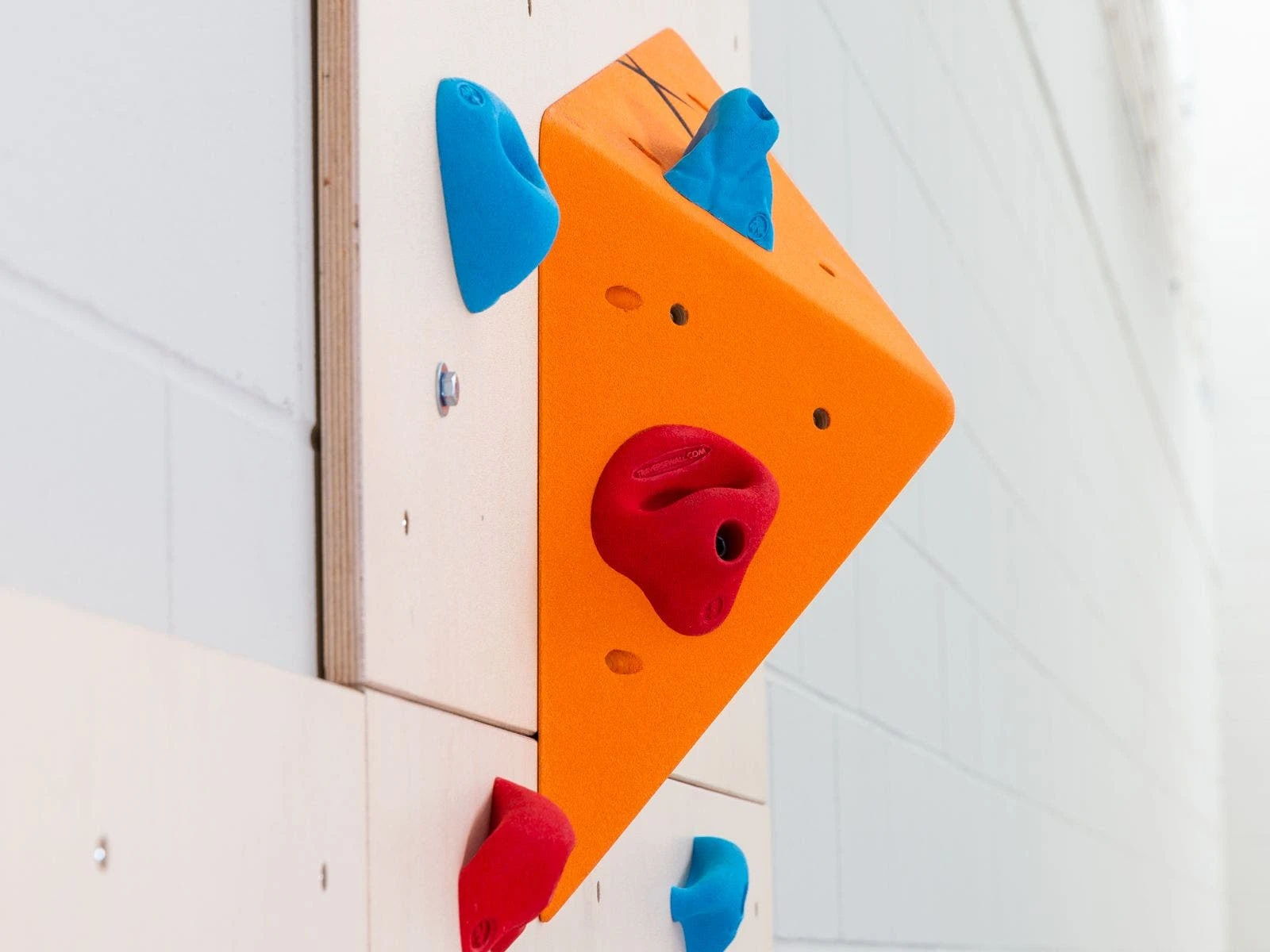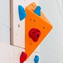 Colorful holds in more unique styles and shapes than other walls create a unique, 3D rock climbing challenge. Each traverse climbing wall panel includes 30 resin holds—that’s 50% more per panel than other options! They are easy to grip and come in purple, lime green, orange, and red, allowing teachers to create color-coded paths or mix them up randomly! Also unique to these walls are orange, wooden climbing volumes (1 per 2 panels). They are larger and stand out a bit more than standard holds, adding to the 3D climbing experience. Each panel also includes a Red-Relief line, reminding climbers to go no higher than 3′ above the floor.
