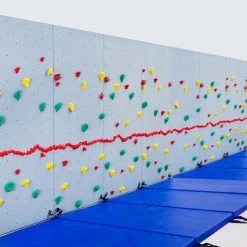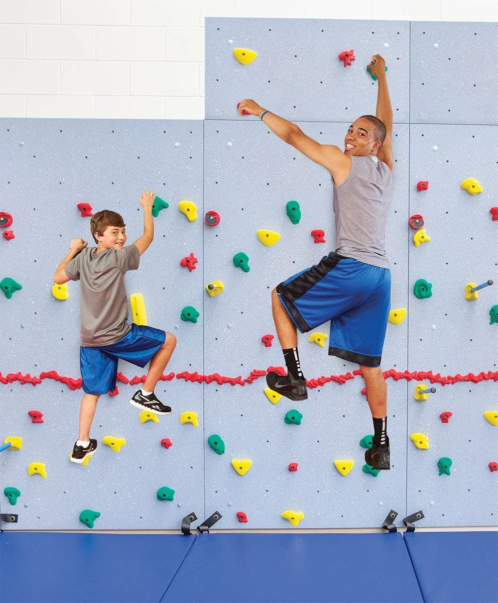 Walls come in a variety of lengths and heights to suit the needs of your space. A 20’W wall accommodates up to 5 climbers at a time, while a 40’W wall gives 10 climbers ample space to traverse. 8’H walls are great for elementary students; 10’H walls are best suited for older students and those with more advanced skills. 10’H walls come in two-piece panels measuring 8′ and 2’H, with both heights available in individual panels as well.