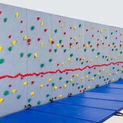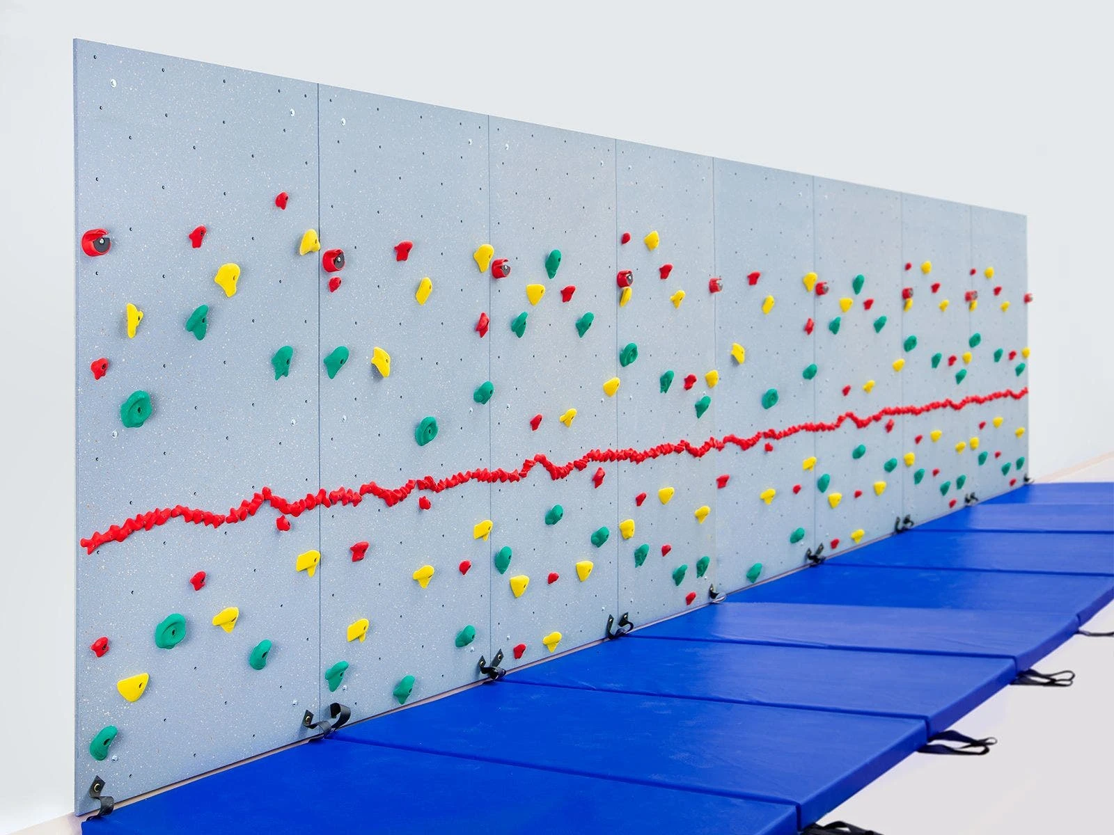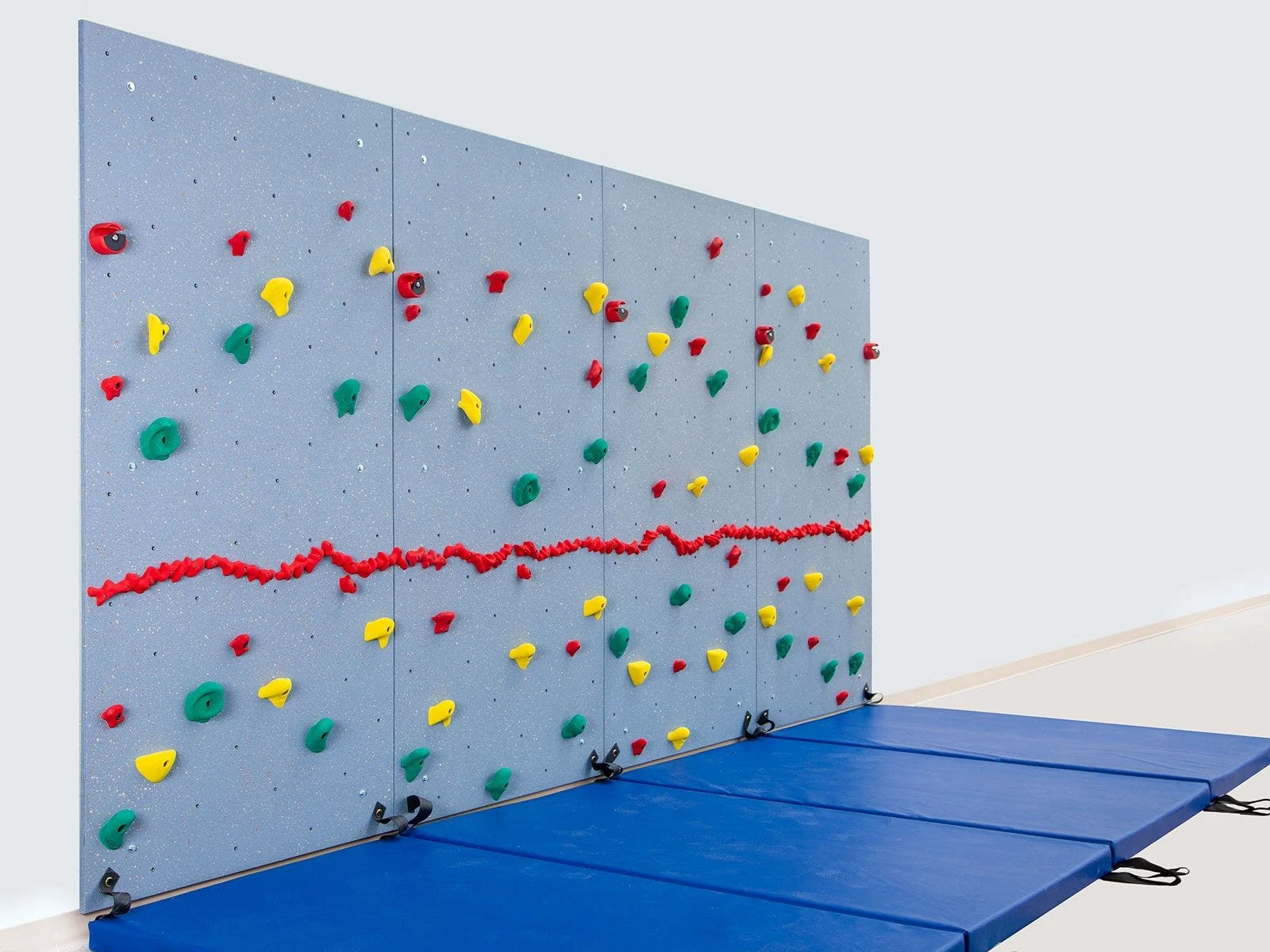 Pre-drilled 3/4″ thick x 4’W panels mount to walls with included bolts and anchors. Panels fit on nearly any wall, allowing schools to pick where they want the activity to take place. The ULTRAVERSE Cordless Mat Locking System (sold separately) is recommended for every climbing wall installation. Wall systems include standard holds, mounting hardware, and a climbing wall rules sign. All walls are for indoor use only. Outlet covers sold separately (please call to order).