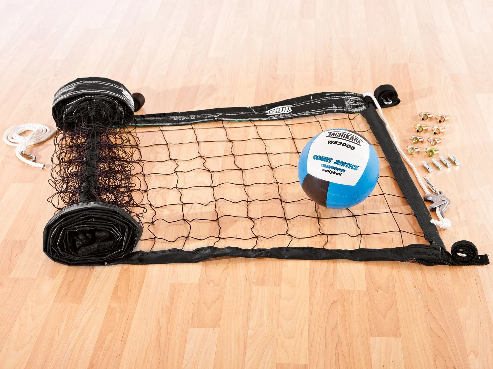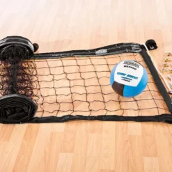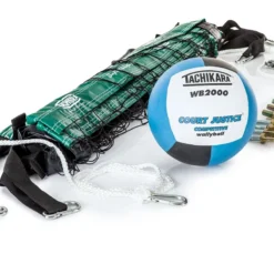 The included Wallyball net is 18’6″L and 36”H. All-black net is easy to see on an all-white racquetball court. The Wallyball ball used in this game looks like a volleyball, but has different features. It’s made of soft rubber that absorbs constant impact on walls and players’ arms.