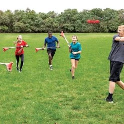 Available in Pro or Fun Level. Pro Level features an aluminum shaft, which includes a lightweight plastic head and a rubber grip for improved handling. The plastic ring spins and floats in the air as players race to catch it on the stick. Fun Level has a shorter length and softer ring for easier tossing and catching. Made with an ABS Plastic Frame.