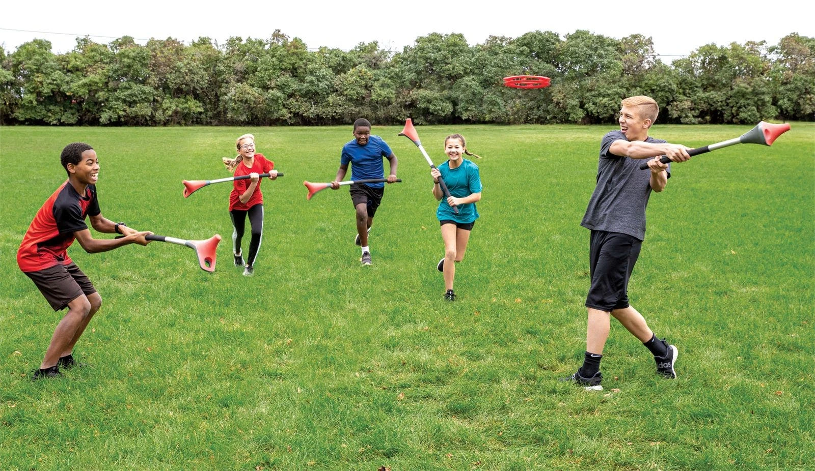 Using a specialized stick, players work together to throw and catch a an 9″ dia ring as they move toward their scoring zone. When offensive players catch the ring, they cannot run with it. They can pivot to find the next available teammate and throw the ring toward them. Players on defense try to intercept it. If the ring hits the ground, the first player to race and place his/her stick on it gains possession. When a team advances the ring to its scoring zone, it earns a point.
